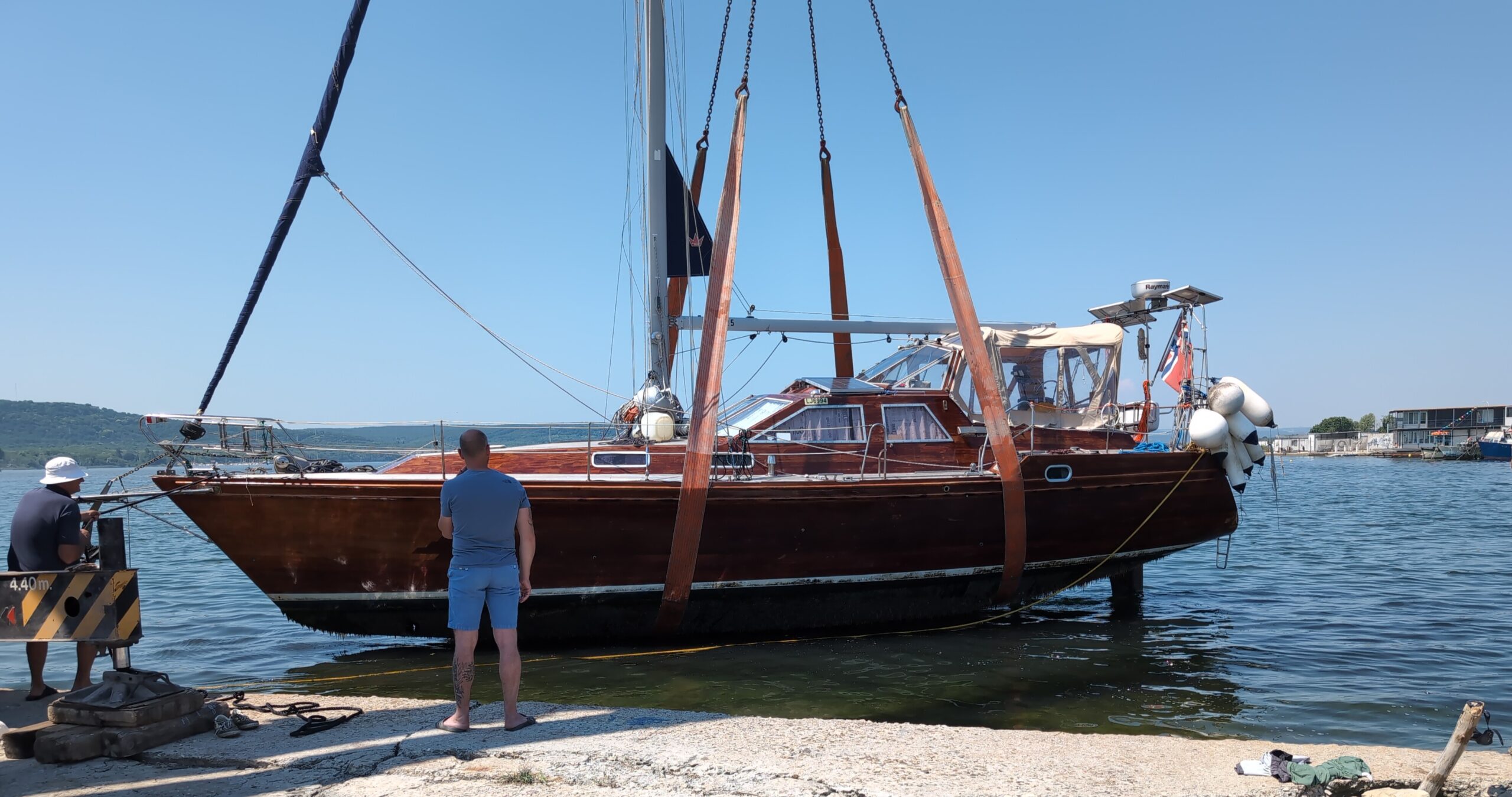 At posh boatyards you can often just dock then relax, watch, and take photos — even washing the hull after the lift is often included. There may still be one major question though, where should the belts go? Does your boats have marks tagging the lifting points?